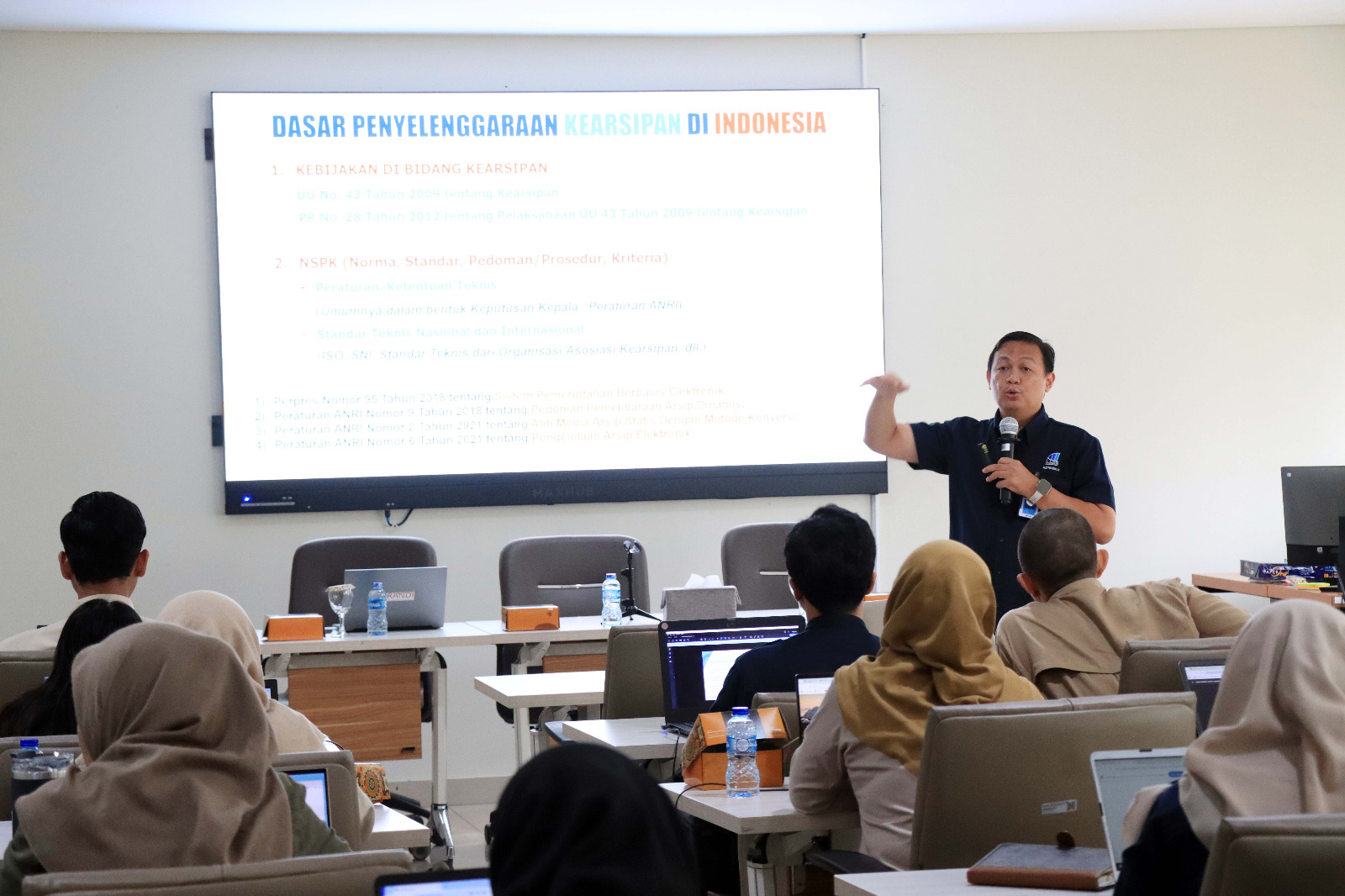 Selain itu, Berty juga menyampaikan bahwa proses penyusutan arsip yang mencakup pemindahan, penyerahan, dan pemusnahan arsip sesuai ketentuan hukum juga sangat krusial untuk menghindari penumpukan dokumen, memastikan efisiensi penyimpanan, serta menjamin konsistensi pengelolaan arsip dengan peraturan yang berlaku.