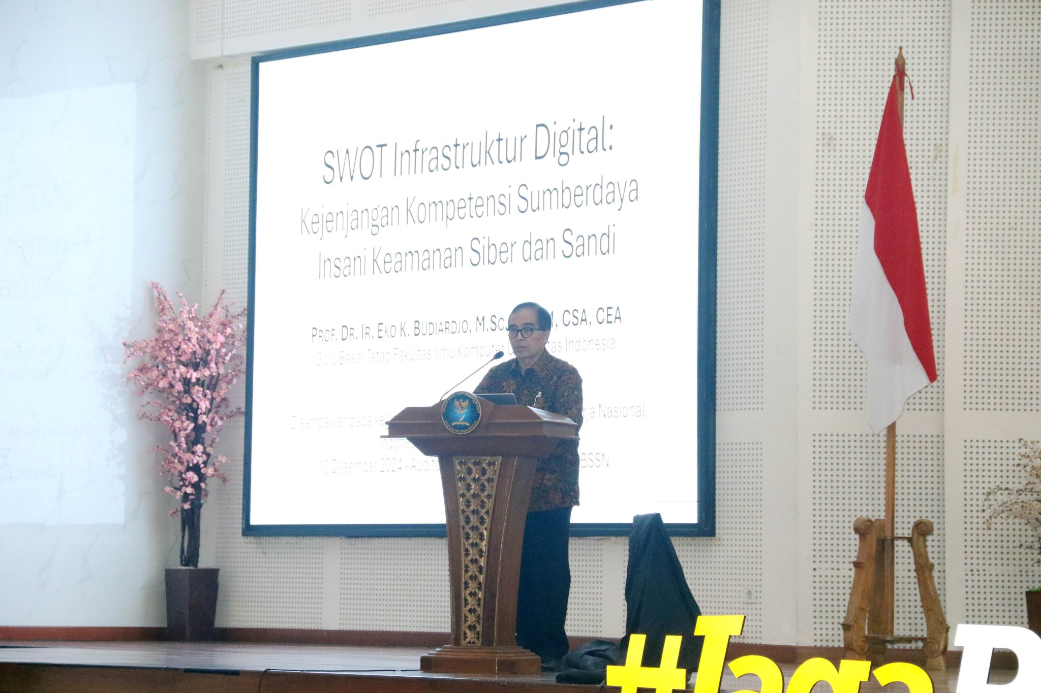 Keynote speech disampaikan oleh Prof. Dr. Ir. Eko K. Budiardjo, M.Sc., Guru Besar Fakultas Ilmu Komputer Universitas Indonesia. Dalam paparannya, ia menggunakan analisis SWOT untuk menyoroti kekuatan demografi dan kemajuan teknologi Indonesia dalam mendukung transformasi digital. Namun, ia juga menekankan pentingnya strategi mitigasi ancaman siber, pengembangan threat intelligence, dan integrasi data guna meningkatkan ketahanan nasional.