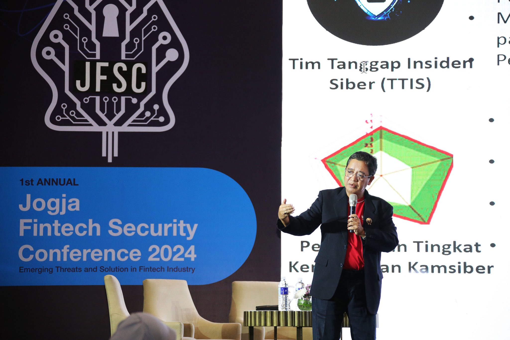 Deputi BSSN Slamet Aji Pamungkas memaparkan ancaman dan solusi keamanan siber bagi industri fintech di Jogja Fintech Security Conference 2024, menekankan peran TTIS, pengukuran kematangan, proteksi data, dan peningkatan kapasitas SDM.
