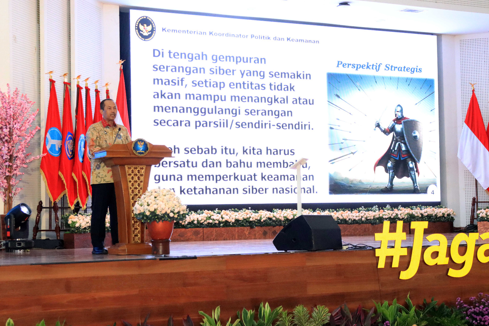 Kegiatan diawali dengan penyampaian laporan kegiatan oleh Deputi III BSSN Dr. Sulistyo, S.T., M.Si., dilanjutkan dengan paparan keynote speech oleh Deputi V Kemenkopolkam Indarto yang menegaskan bahwa menghadapi ancaman siber yang semakin kompleks tidak bisa dilakukan secara terpisah. “Diperlukan kolaborasi erat antara pemerintah, akademisi, industri, media, serta asosiasi dan komunitas siber untuk memperkuat keamanan serta ketahanan siber nasional,” ujarnya.