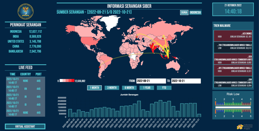 Sejak tahun 2018, Badan Siber dan Sandi Negara mengembangkan sistem deteksi dini ancaman siber bekerja sama dengan Indonesia Honeynet Project. Jenis ancaman siber terbesar berbasis malicious software (malware). Salah satu perangkat deteksi Malware yang digunakan adalah Honeypot. Honeypot merupakan sistem replika yang dirancang memberikan interaksi yang sama dengan sistem asli sehingga penyerang tidak menyadari identitas dan teknik serangan yang dilakukan direkam oleh Honeypot sehingga informasi tersebut dapat ditabulasi menjadi sumber informasi penting dalam mempelajari jenis, pola dan teknik serangan siber. Mengingat data serangan yang dikumpulkan harus komprehensif maka beberapa Honeypot dibuat saling terhubung dalam sebuah sistem yang disebut Honeynet. Berikut dilampirkan beberapa tautan terkait Honeynet Project BSSN untuk diakses/diunduh bebas dan disebarluaskan kepada masyarakat.