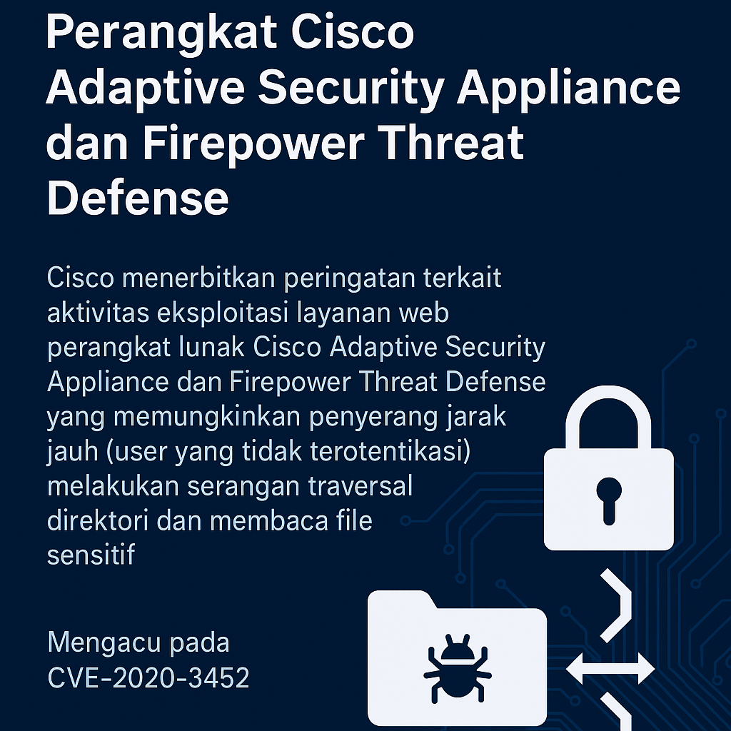 Cisco Systems telah merilis peringatan keamanan terkait ditemukannya aktivitas eksploitasi terhadap layanan web pada perangkat lunak Cisco Adaptive Security Appliance (ASA) dan Cisco Firepower Threat Defense (FTD). Kerentanan ini memungkinkan penyerang jarak jauh yang tidak terotentikasi untuk melakukan serangan path traversal dan mengakses file-file sensitif yang tersimpan di dalam sistem perangkat, khususnya file dengan hak akses baca (read-only). Kerentanan ini terdaftar secara resmi dengan kode CVE-2020-3452 dan dikategorikan sebagai kerentanan dengan tingkat tinggi karena bisa disalahgunakan tanpa memerlukan kredensial atau akses awal ke sistem.