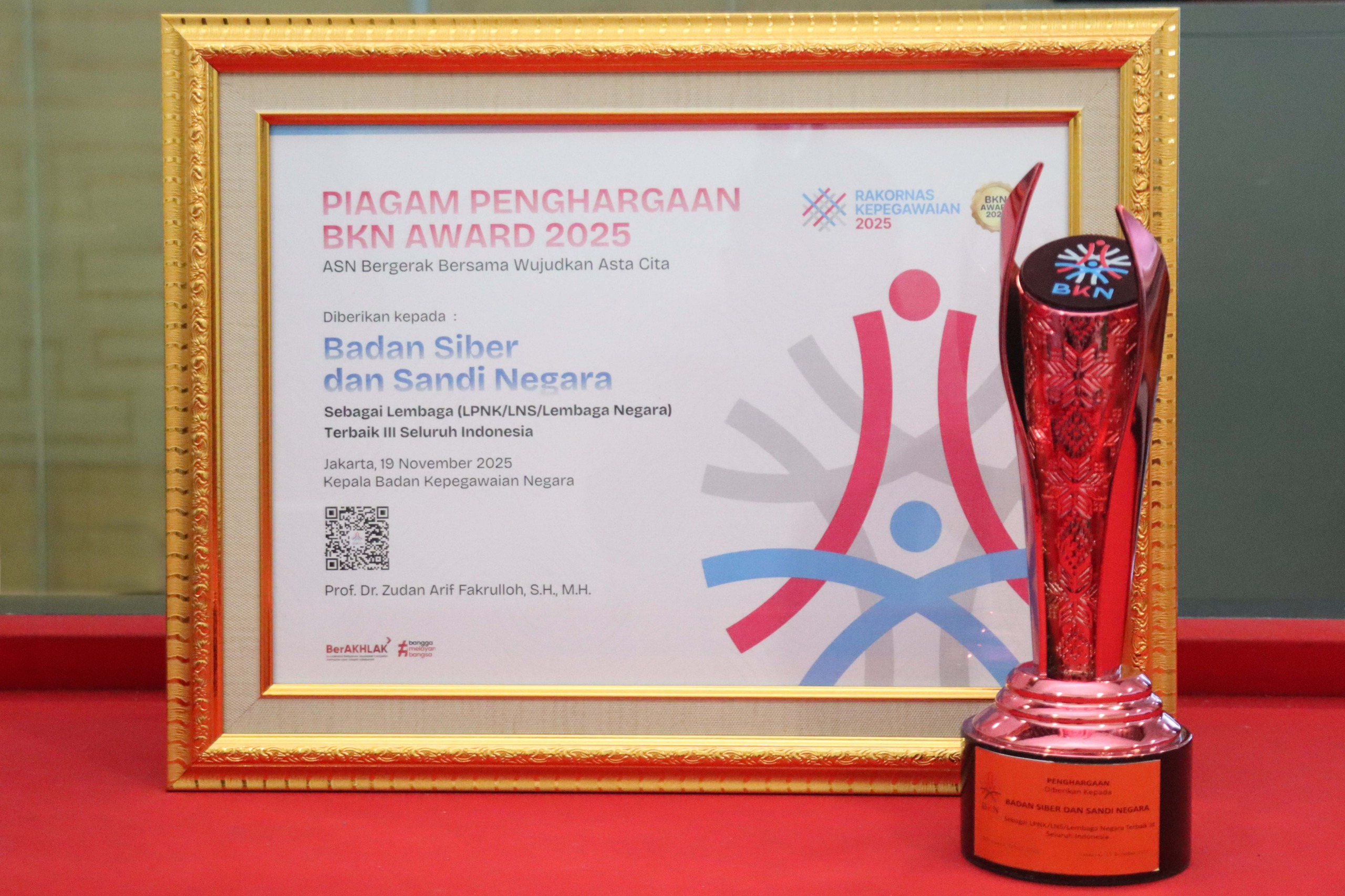 Penghargaan BKN Award 2025 diserahkan langsung oleh Kepala Badan Kepegawaian Negara (BKN), Prof. Zudan Arif Fakhrullah, kepada Sekretaris Utama BSSN, Y.B. Susilo Wibowo. Prosesi penyerahan berlangsung dalam Forum Konsolidasi Nasional para Pengelola Kepegawaian se-Indonesia melalui Rapat Koordinasi Nasional (Rakornas) Kepegawaian 2025, yang digelar di Jakarta pada Rabu (19/11/2025).