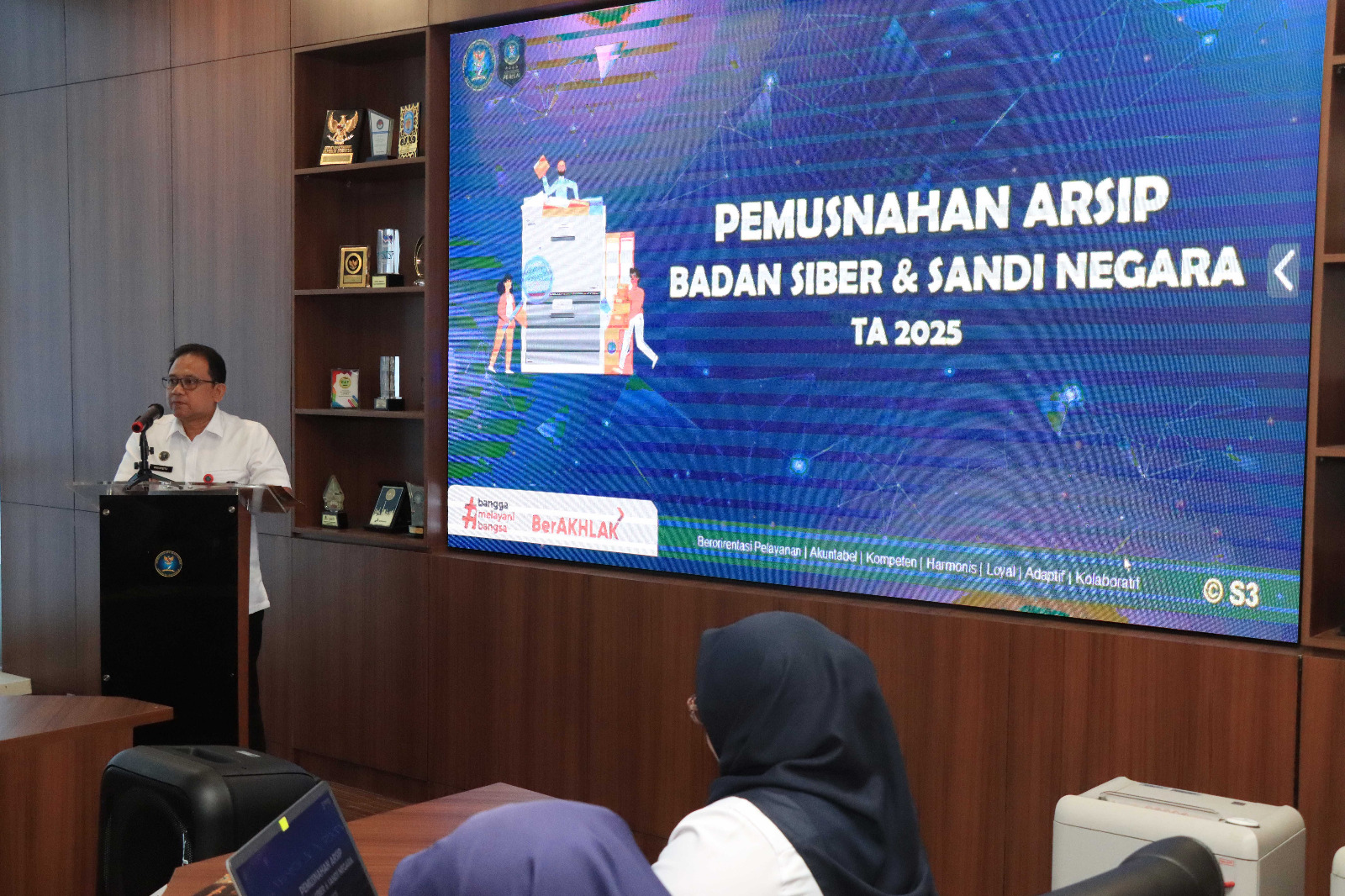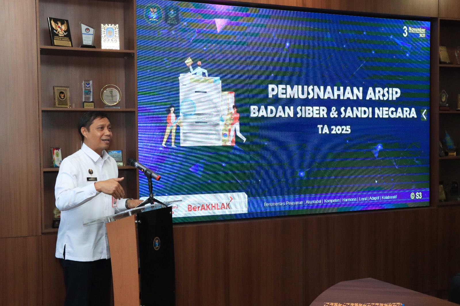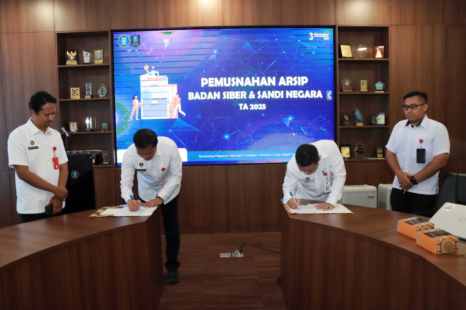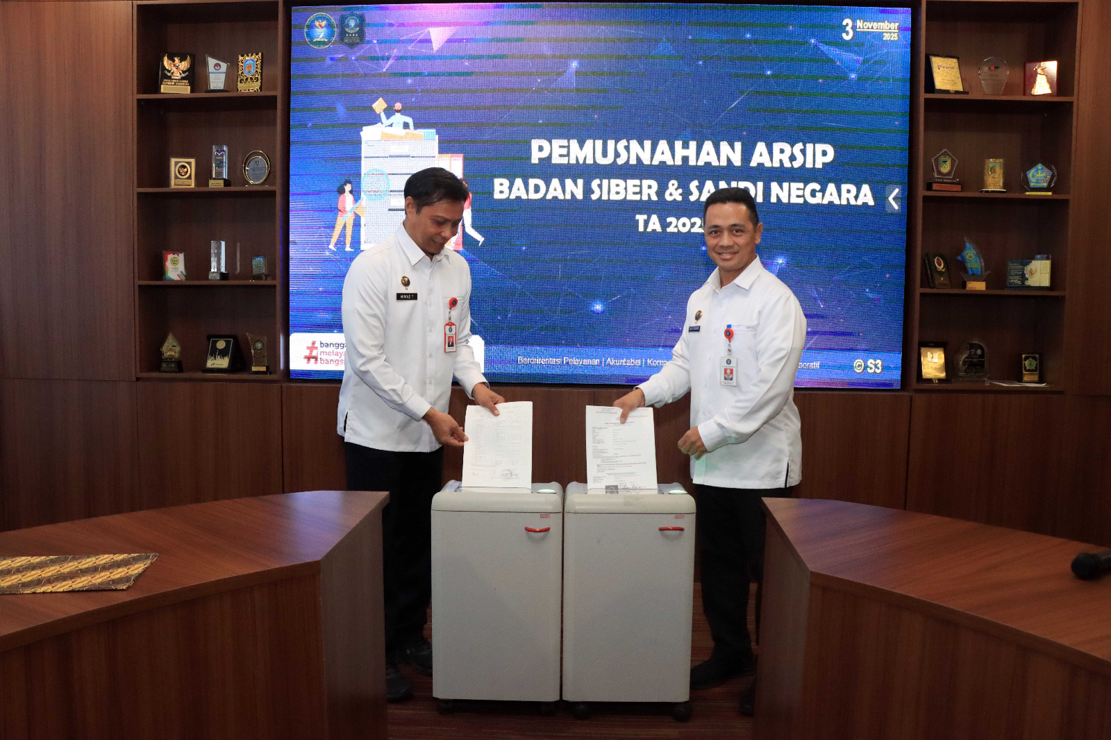 Depok, BSSN.go.id – Badan Siber dan Sandi Negara (BSSN) melalui Tim Naskah Dinas dan Kearsipan (NDK) melaksanakan pemusnahan arsip Politeknik Siber dan Sandi Negara (Poltek SSN) tahun 2025 di kantor BSSN Sawangan, Depok 3/11/2025.