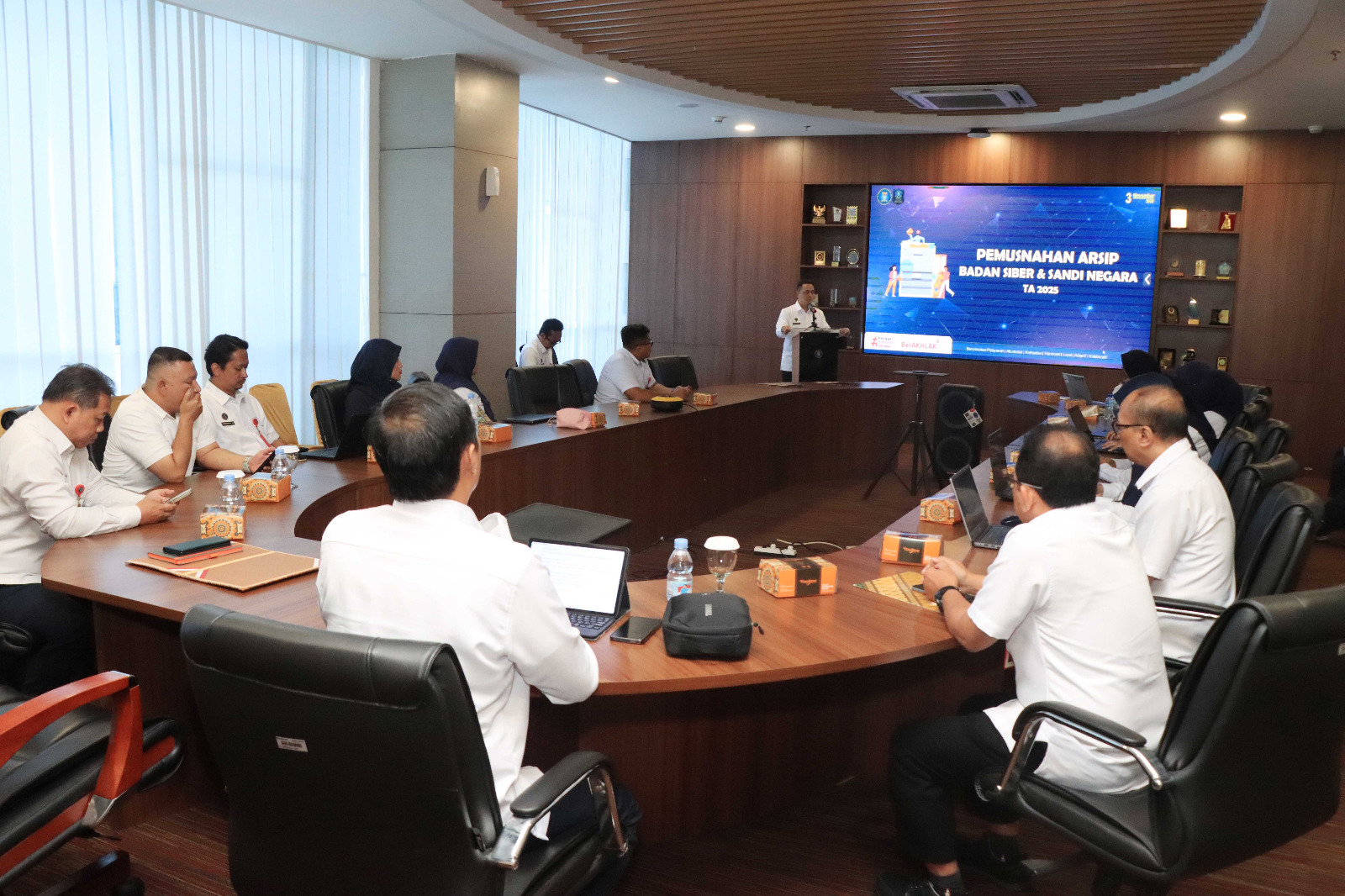 Selanjutnya sambutan Kepala Biro Hukum dan Komunikasi Publik Brigjen TNI Berty BW Sumakud, SH., MH. menyampaikan kegiatan ini merupakan wujud komitmen bersama dalam menjaga akuntabilitas, transparansi, dan tata kelola arsip yang baik sesuai dengan Undang-Undang Nomor 43 Tahun 2009 tentang Kearsipan. “Arsip yang dimusnahkan telah melalui proses penilaian dan verifikasi sesuai dengan peraturan Jadwal Retensi Arsip yang berlaku di BSSN, sehingga pemusnahan ini dilakukan secara sah, aman, dan bertanggung jawab”.