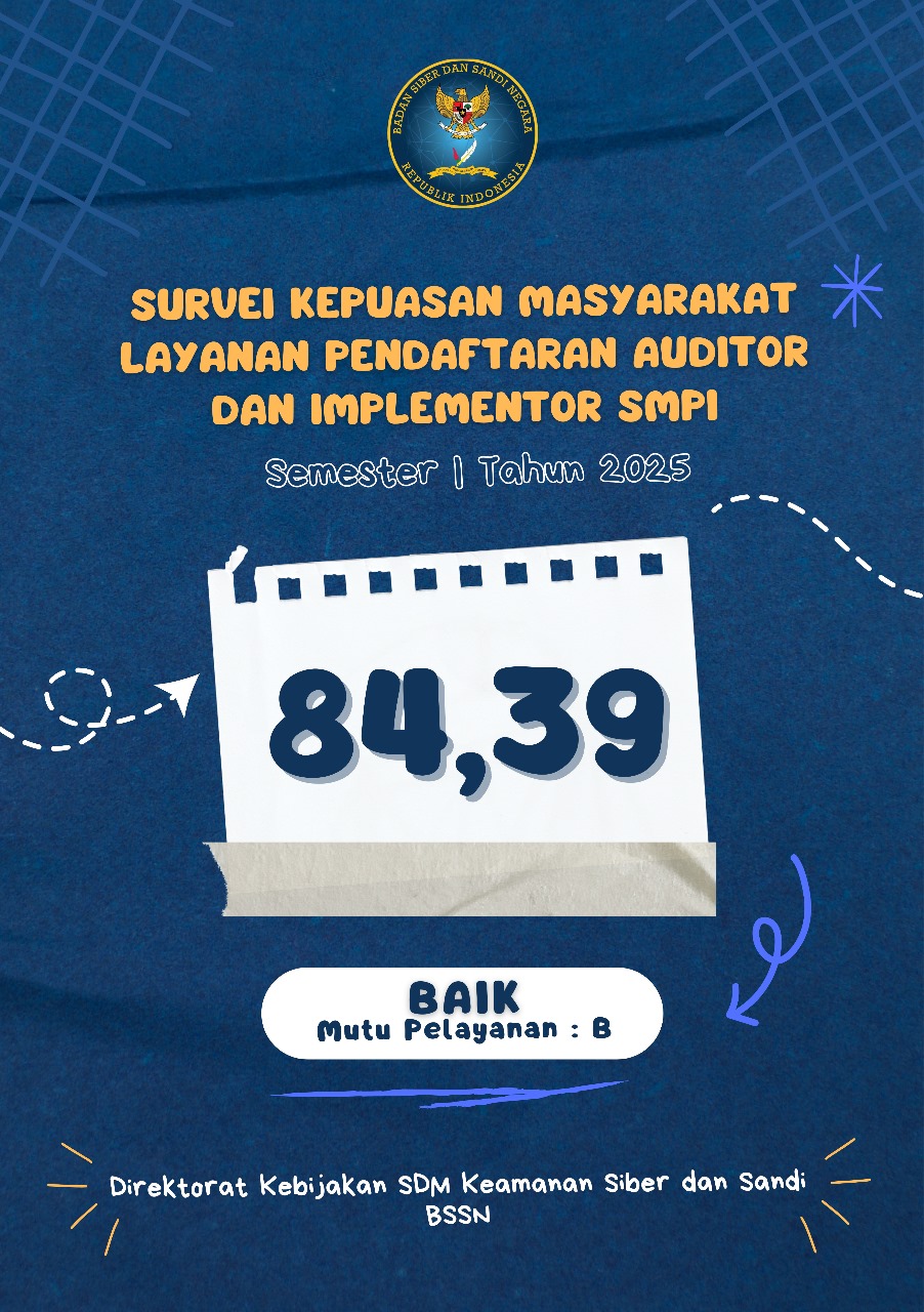 Berdasarkan pelaksanaan Survei Kepuasan Masyarakat (SKM) periode semester 1 sejak bulan Januari hingga Juni 2025, Layanan Pendaftaran Auditor Keamanan Informasi dan Implementor Sistem Manajemen Pengamanan Informasi (SMPI) mendapatkan nilai 84,39 dengan mutu pelayanan Baik.