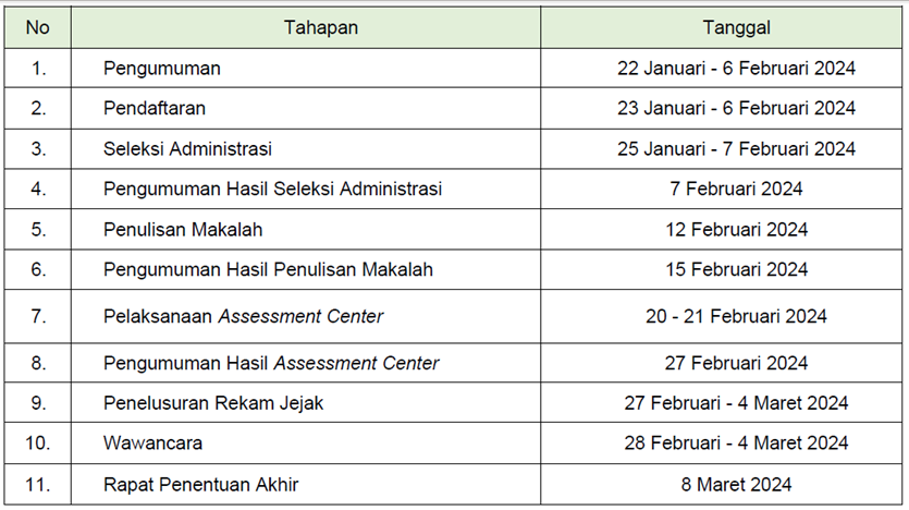 Informasi mengenai seleksi terbuka pada jabatan Pimpinan Tinggi Pratama BSSN 2024 dapat diunduh di bawah ini:
