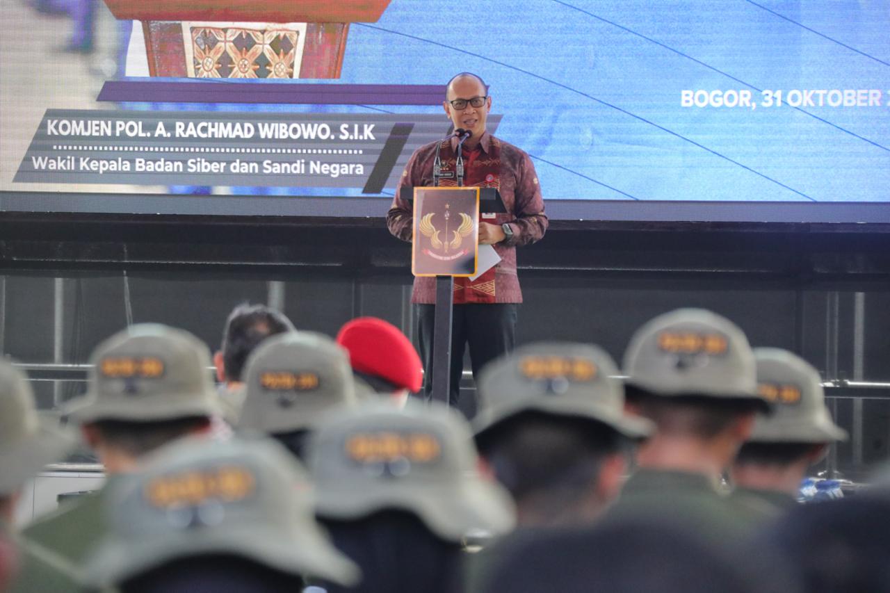 Bogor, BSSN.go.id — Wakil Kepala Badan Siber dan Sandi Negara (BSSN) Komjen Pol A. Rachmad Wibowo, S.I.K. memberikan Jam Pimpinan kepada para calon taruna Politeknik Siber dan Sandi Negara (Poltek SSN) yang tengah menjalani pelatihan dasar militer di Kesatrian Batalyon 13 Grup 1 Kopassus, Bogor.(31/10)